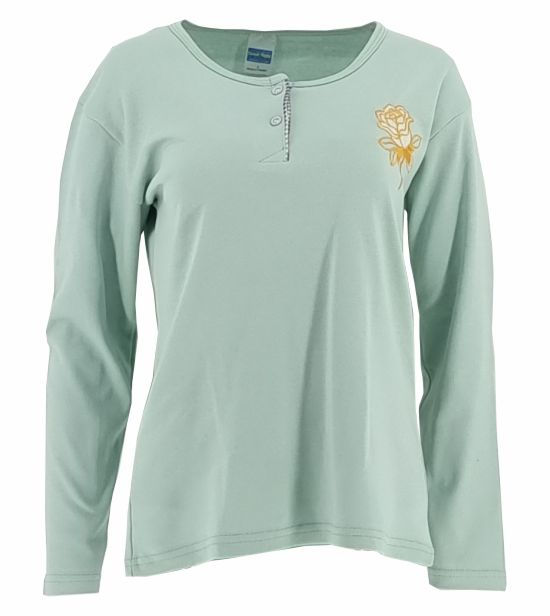 Μονόχρωμη μπλούζα με διακριτικό κέντημα στο στήθος, λαιμόκοψη με 2 κουμπάκια.